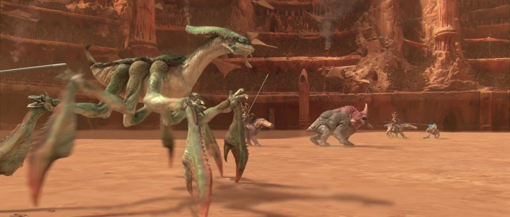 Taking inspiration from the Ray Harryhausen stop-motion movies like The 7th Voyage of Sinbad, and Clash of the Titans, the monsters of the arena pose challenges that allow Anakin, Obi-Wan, and Padme to combine their strengths. Good monsters should not only excite the imagination, they must propel the narrative. During much of Attack of the Clones, Anakin and Padme are separated from the older, wiser Obi-Wan. And they make mistakes. But when the trio is finally reunited, they face a collective threat that encourages teamwork and rewards cooperation with survival. Our heroes defy the beasts one by one and deny their captors a slaughter. Obi-Wan, Anakin, and Padme turn a blood sport into a triumph of will and an illustration of the power of friendship.