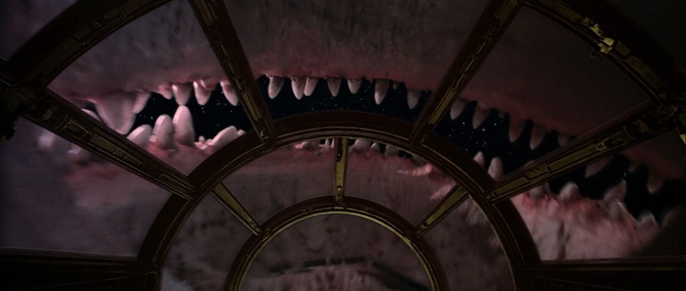 The characters are allowed a brief respite and the film takes this opportunity to exhale after the breathless momentum of the first act. But safe havens are not what they seem to be in this universe. It doesn’t take long for Han to realize he made a mistake and he hastily turns the ship around and heads for the cave’s opening. The entrance is collapsing. The entrance also has teeth. The Falcon barely escapes the lunging maw of a giant space worm. Echoing the Biblical tale of Jonah, the heroes exit the belly of the monster and learn that fates worse than Imperial capture lurk in the cold vacuum of space.