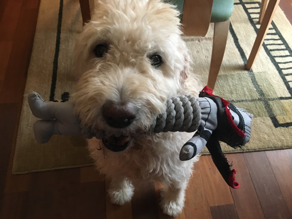 Ernie was the name I gave to a ball of fur with a funny little tuft of hair on top of his head. The tuft reminded me of the hair on the head of Ernie of Sesame Street. Only the Muppet’s hair was black. This puppy’s fur was almost white. Didn’t matter. Ernie was still a great name. So the 10-week-old Labradoodle was christened Ernie on the ride home.