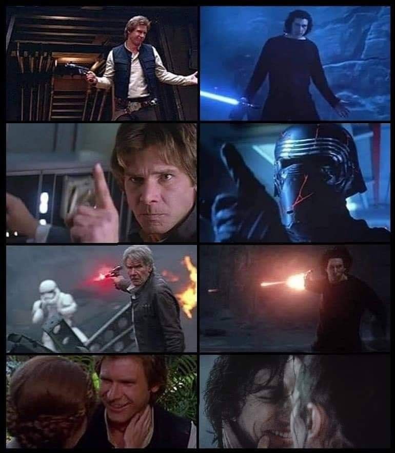 While Han isn’t conscious of the connection between his and Kenobi’s sacrifice, the visual language of Rise of Skywalker makes it pretty clear that Ben Solo’s is connected to his father.