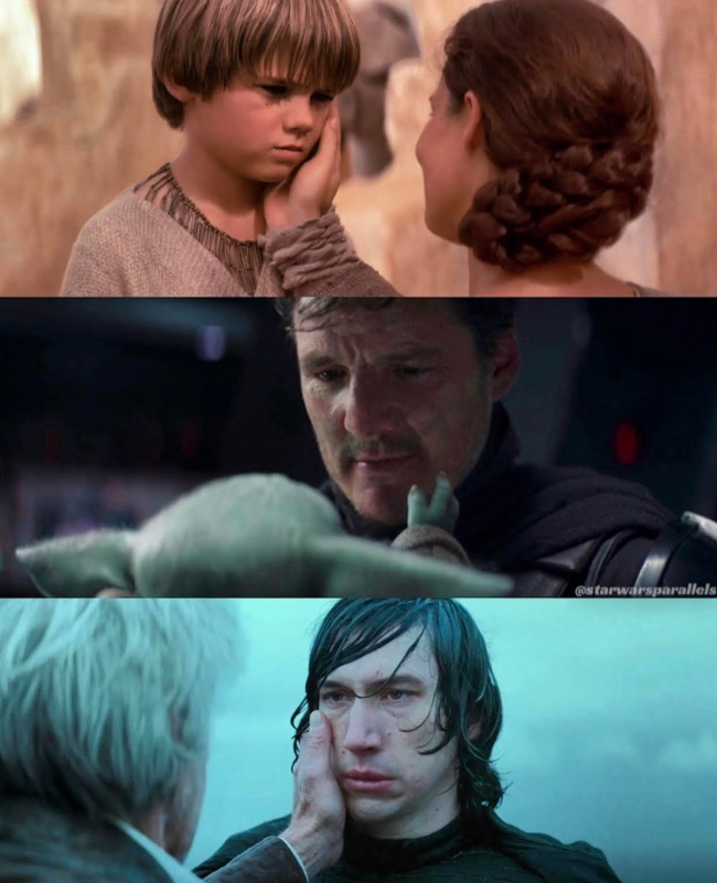 As the old cliche goes, “It’s poetry. It rhymes.” The reason the Din Djarin/Grogu relationship works, beyond the fantastic character development across the series, is because we’ve seen these family relationships, these found families, in Star Wars over and over again. Some have been for the good, some not so much. But that weight is there, reminding us of how such has shaped the galaxy we know already, tempting us to consider how these moments will shape the galaxy going forward. These echoes, these parallels, these rhymes and reflections, shape how audiences read the scene and the story.