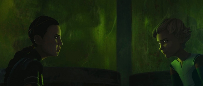 Alpha and Omega are not the only ones whose sides are unclear. Originally assumed to have been hired by Lama Su, Fennec Shand returns in this episode to once more try to get through to Omega. Later it is revealed that she is in fact working for Nala Sa, the Kaminoan specifically responsible for Omega at the start of the series. While Nala Se did help The Bad Batch escape, her proximity to Lama Su and her role in Omega’s life still leave in question her loyalties. The easy answer is that she wants to protect Omega, that she loves her and views her as a surrogate daughter. But if Attack of the Clones teaches us anything (other than that Obi-Wan can be “very grumpy”) it is that the answers on Kamino are never easy.